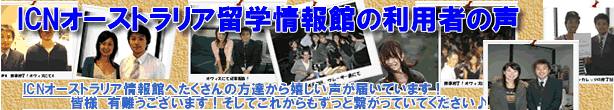 | ワーキングホリデー生活もオーペアと学校であっという間に1年が過ぎました。一度日本に帰ったけれど、もう少し英語を勉強したかったのと、チャイルドケアの学校があることを少し知っていたので学生ビザで再び オーストラリアに行くことを決めました。でも、どうやって学生ビザを取っていいのか?チャイルドケアの学校は どれ位あるのか?どこの学校がいいのか?費用はどれ位必要なのか?何も知りませんでした。オーストラリアに 住んでいる友達に電話で連絡を取ったところ、R さんのエージェント良いらしいよ!と聞き R さんに連絡先を聞き、淳さんにすぐ電話しました。電話一本だったけど聞いていた通り、本当に親身になって考えてくれて、 アドバイスをしてくれたので日本に居る間にする事、オーストラリアに着いてからする事が順調に進みました。紹介してくれた語学学校も自分の思ってたような学校だったし、今はチャイルドケアを必死になりながらも楽しく勉強しています!!そして、情報館がサポートしてくれているのは学校の事だけではなくて、その他生活に関する事も沢山で本当に助けられてます。 つい最近も・・・引っ越した際に電気会社に住所変更したことを伝えなきゃいけないのに私の英語が不十分で伝わらず、聞き取れずで代わって伝えてもらいました。ありがとうございました;) 場所も CITY のど真ん中にあって、新しく☆綺麗で☆ スタッフの皆さんがいつも素敵な笑顔で迎えてくれるので、とても行きやすいです;) 最後になりましたが、淳さん、その他スタッフの皆さん本当にお世話になっています。情報館を知る事が出来て良かったです。これからもよろしくお願いします!!! |